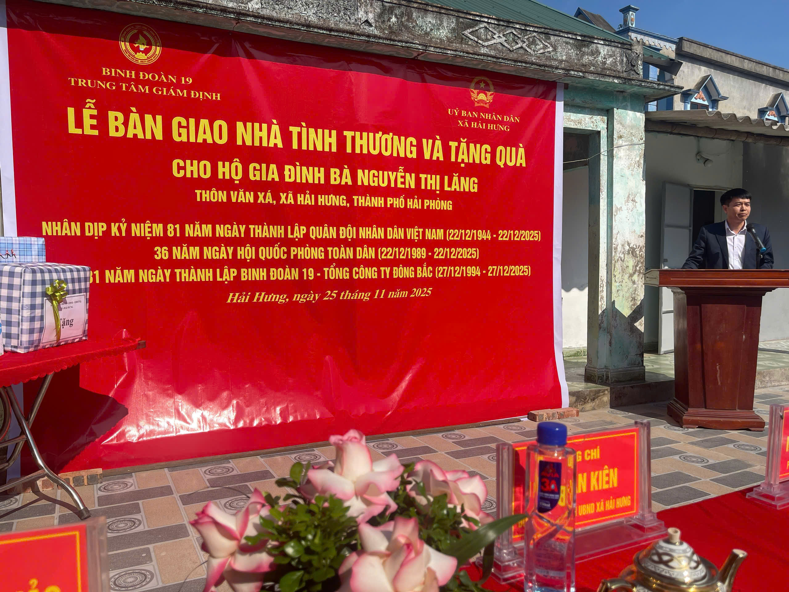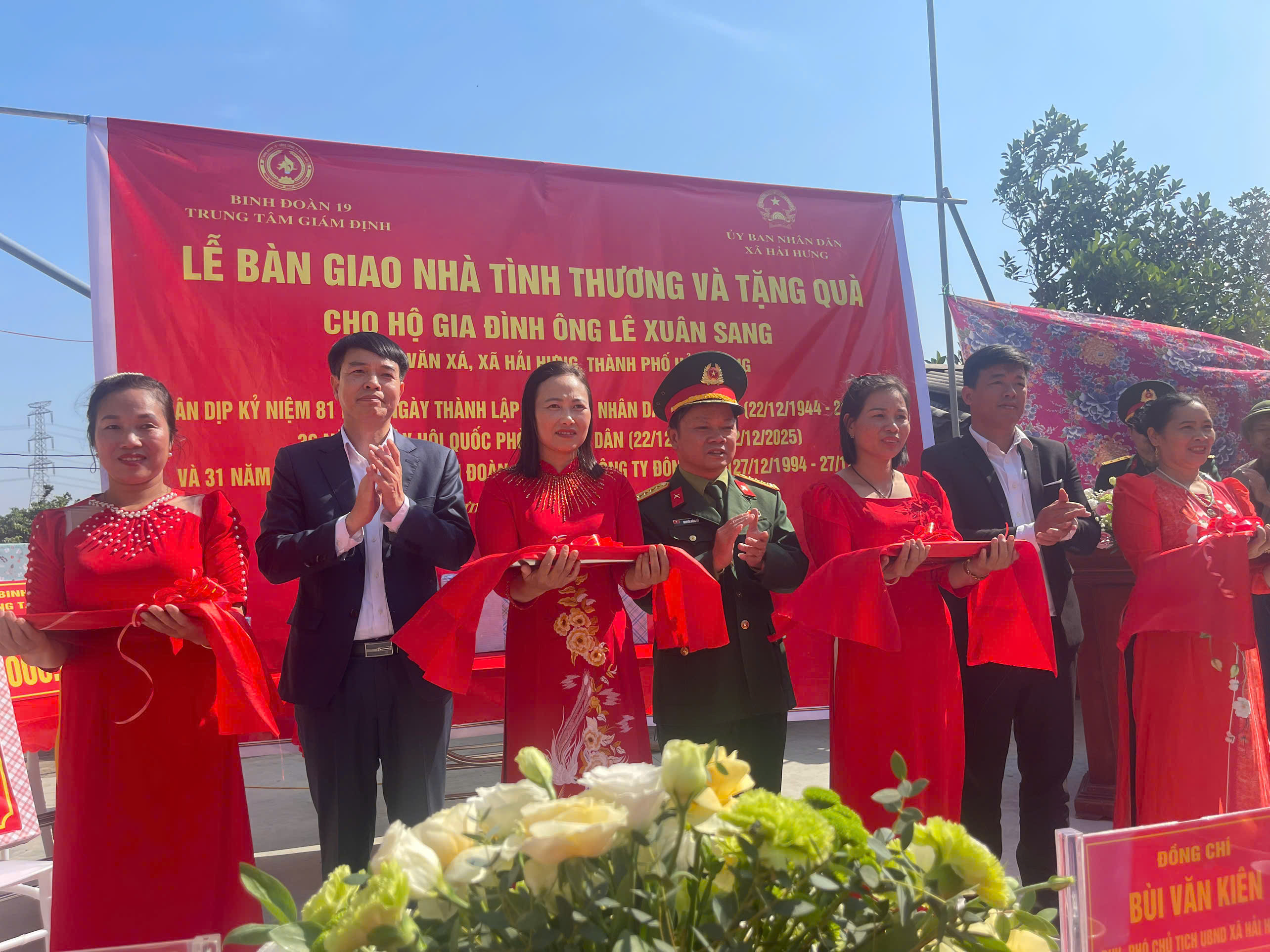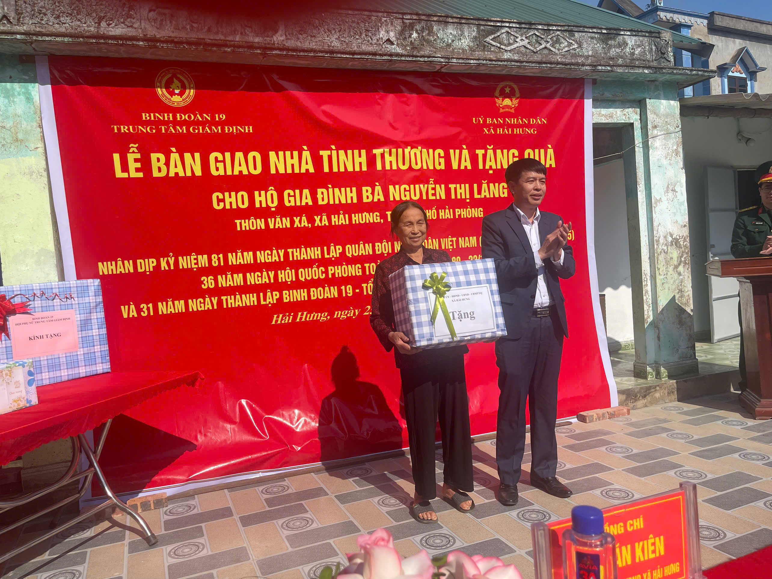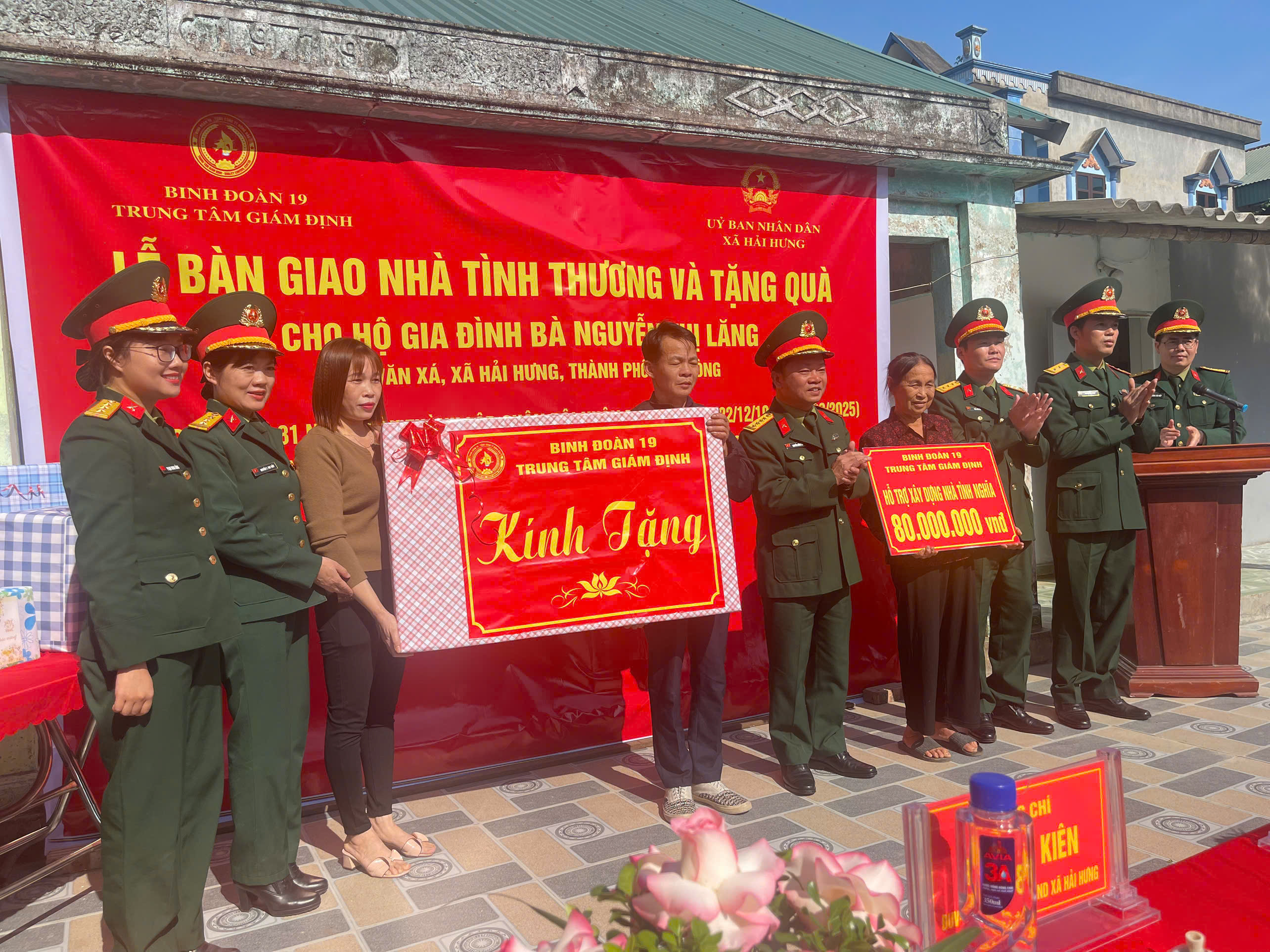 BINH ĐOÀN 19 TRUNG TÂM GIÁM ĐỊNH PHỐI HỢP UBND XÃ HẢI HƯNG TỔ CHỨC LỄ BÀN GIAO NHÀ TÌNH THƯƠNG VÀ TẶNG QUÀ CHO HỘ GIA ĐÌNH ÔNG LÊ XUÂN SANG VÀ BÀ NGUYỄN THỊ LĂNG CÙNG Ở THÔN VĂN XÁ, XÃ HẢI HƯNG